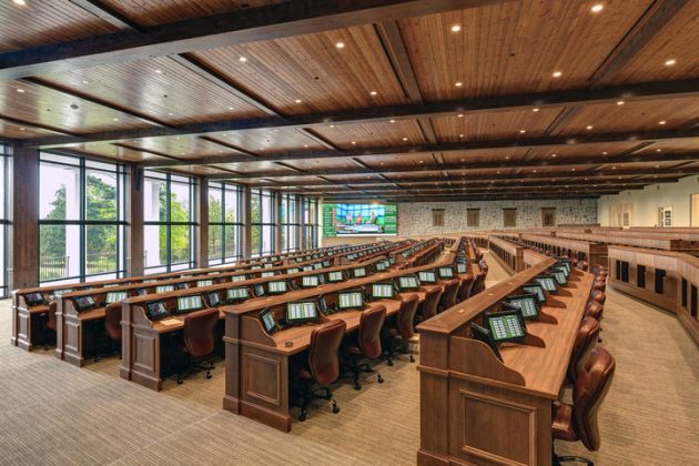 There, rows of desks stretch to the huge windows at the far end of the room, through which the driving range is visible.